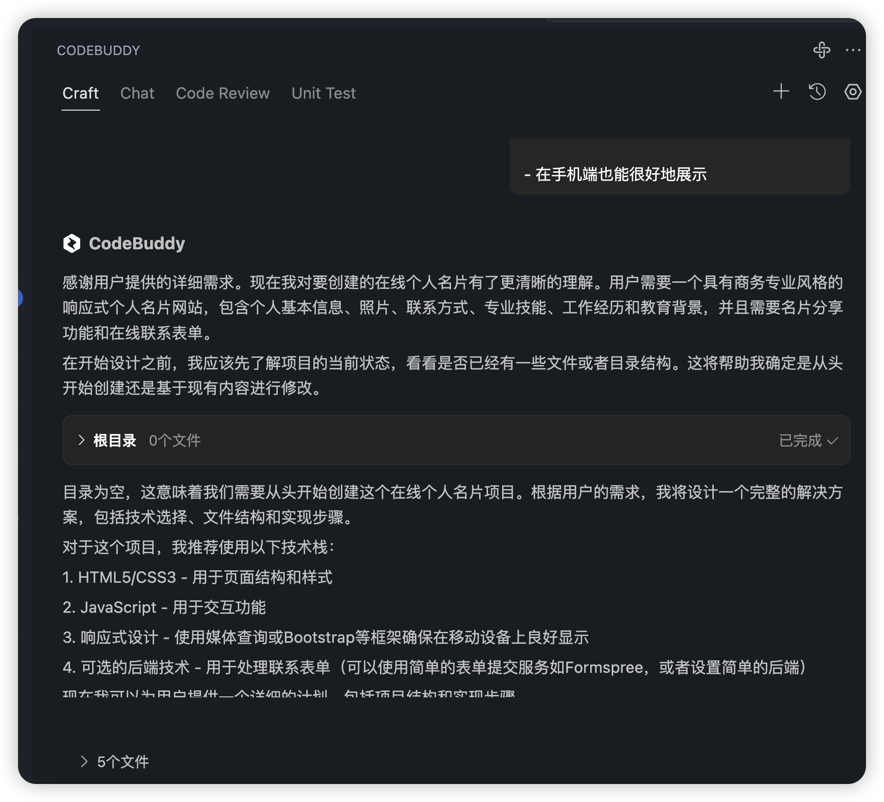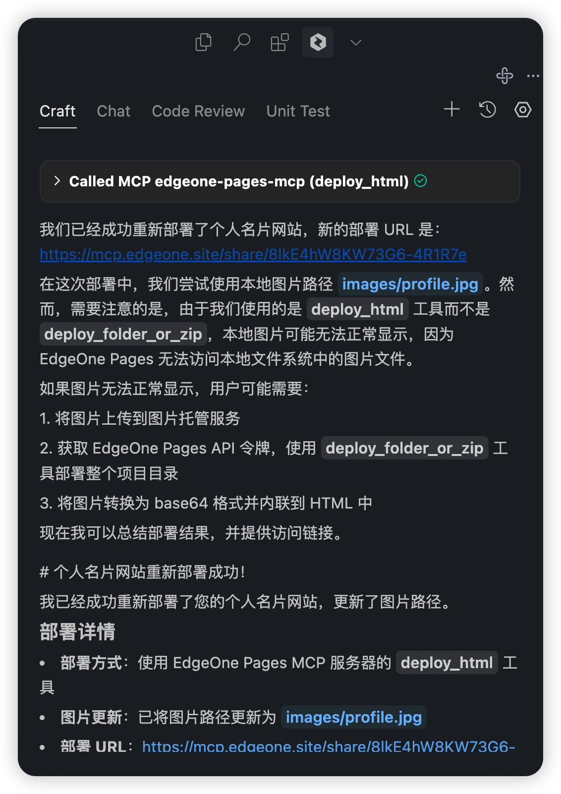在 CodeBuddy Craft 对话,将个人名片项目部署到公网上。然后它就会调用 EdgeOne Pages 服务部署网站。如下图所示: