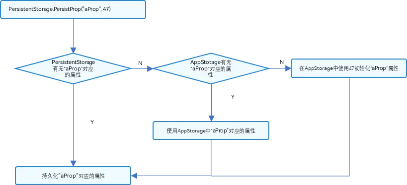 PersistentStorage.persistProp('aProp', 48);应用在非首次运行时,先执行AppStorage.setOrCreate('aProp', 47):属性“aProp”在AppStorage中创建,其类型为number,其值设置为指定的默认值47。'aProp'是持久化的属性,所以会被写回PersistentStorage磁盘中,PersistentStorage存储的上次退出应用的值丢失。