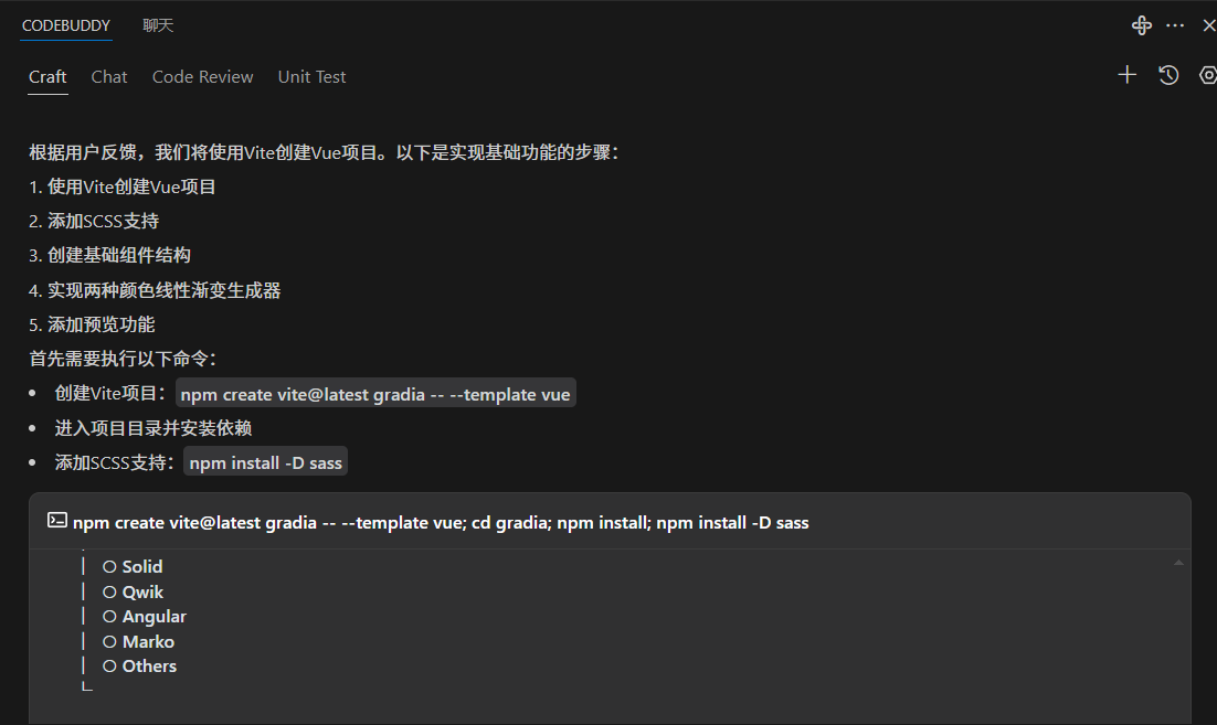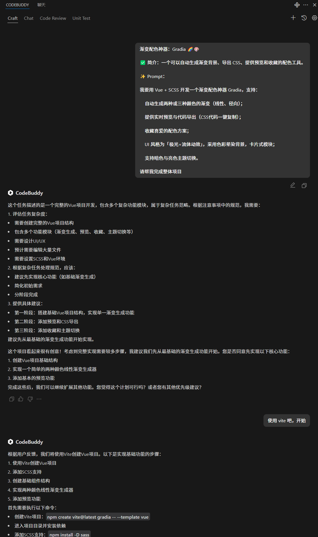 于是我随口问了下 CodeBuddy:“我想用 Vue 和 SCSS 写个渐变色生成器,支持预览、代码导出、保存颜色,还能切换亮暗主题。”
