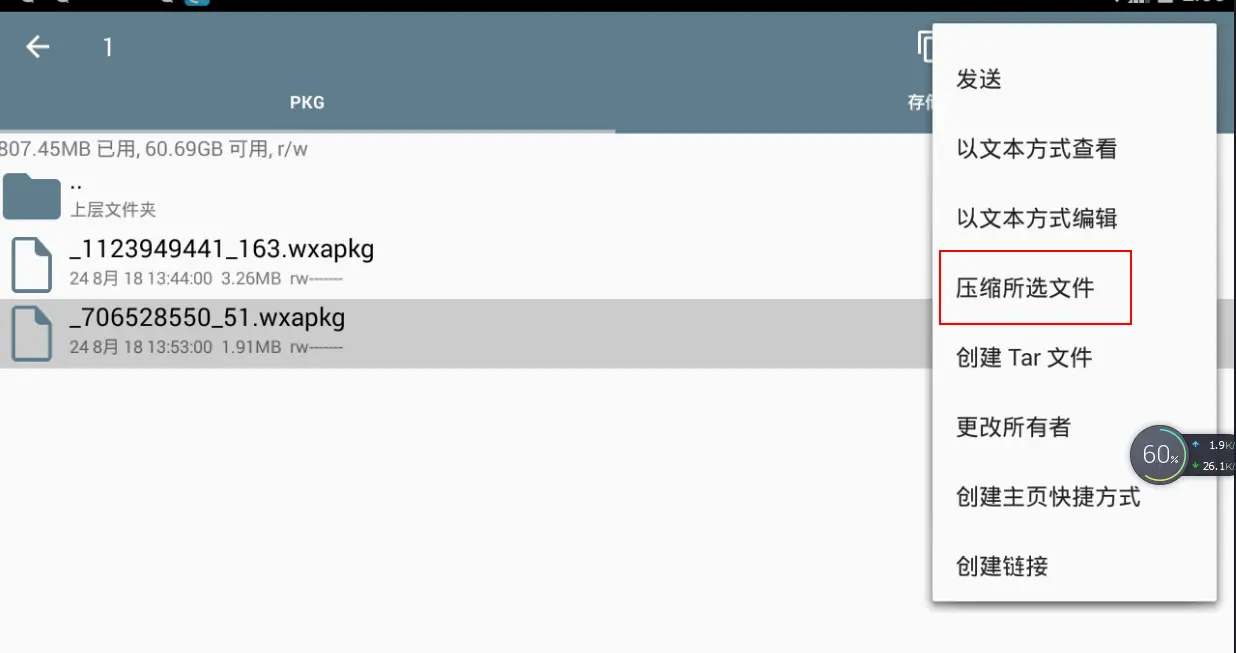 你会看到发现里面的一些.wxapkg后缀的文件,可以根据时间来判断那个是你需要小程序.wxapkg文件,右键长按文件,点击右上角压缩所选文件,然后再将压缩好的包通过微信发送给好友或者文件助手