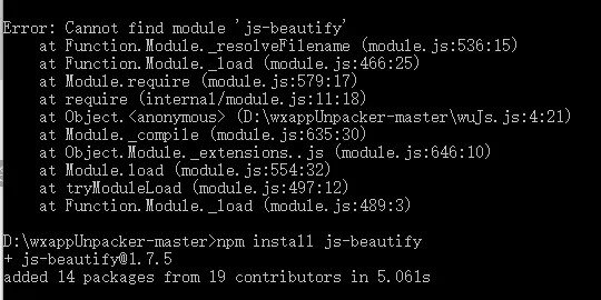 1:使用node wuWxapkg.js 反编译命令时,如果报 Cannot find module 'xxx' 这种类型的错误,