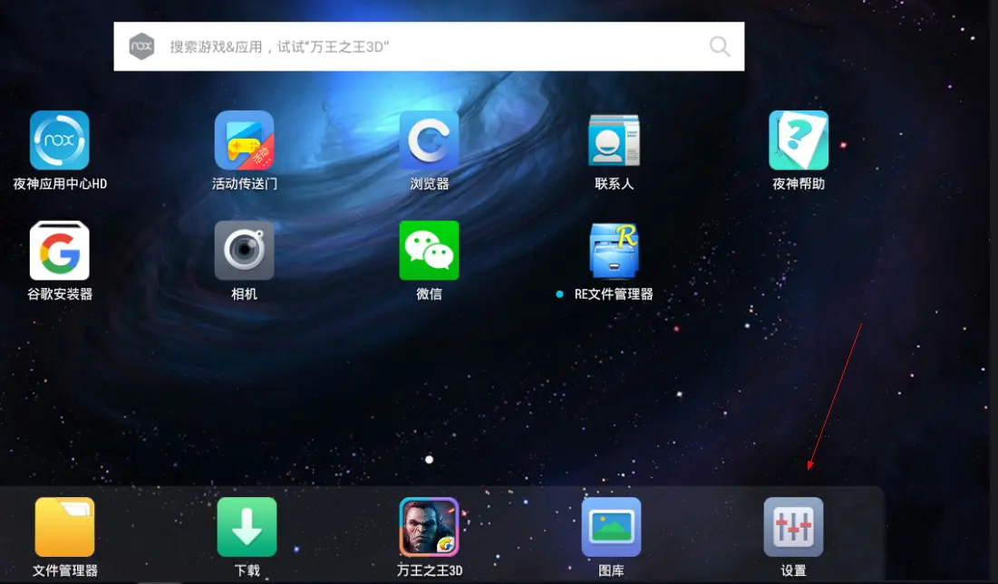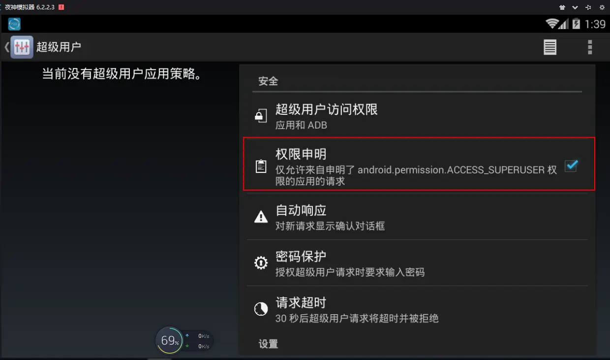 打开安装好的安卓模拟器,并在模拟器中安装微信、RE文件管理器,下载好的RE文件管理器安装包直接拖拽进打开的模拟器窗口就会自动安装,设置模拟器允许应用获取root权限,点击首页右下角设置,找到超级用户选项,点进去即可,这些操作的目的都是为了能让RE文件管理器顺利的获取到ROOT权限步骤如下图所示: