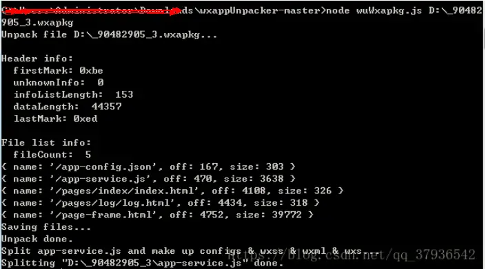 在.wxapkg文件所在目录下输入 node wuWxapkg.js [-d] //files 就是你想要反编译的文件名 例如:我有一个需要反编译的文件 _163200311_32.wxapkg 已经解压到了D盘根目录下,那么就输出命令 node wuWxapkg.js D:_163200311_32.wxapkg