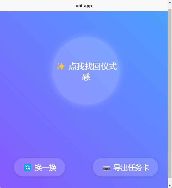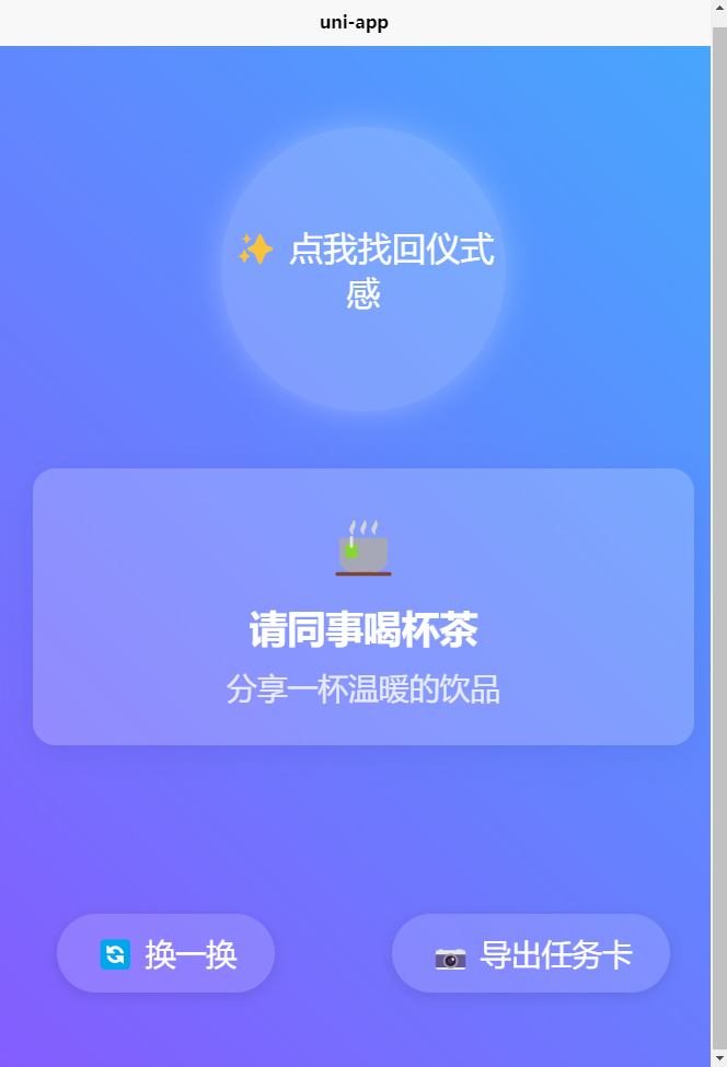 我说,我想做个叫「MoodSpark」的小页面,点一下按钮,就弹出一句带 emoji 的幸福任务,用 UniApp 来开发。样子不用复杂,但氛围要到位。