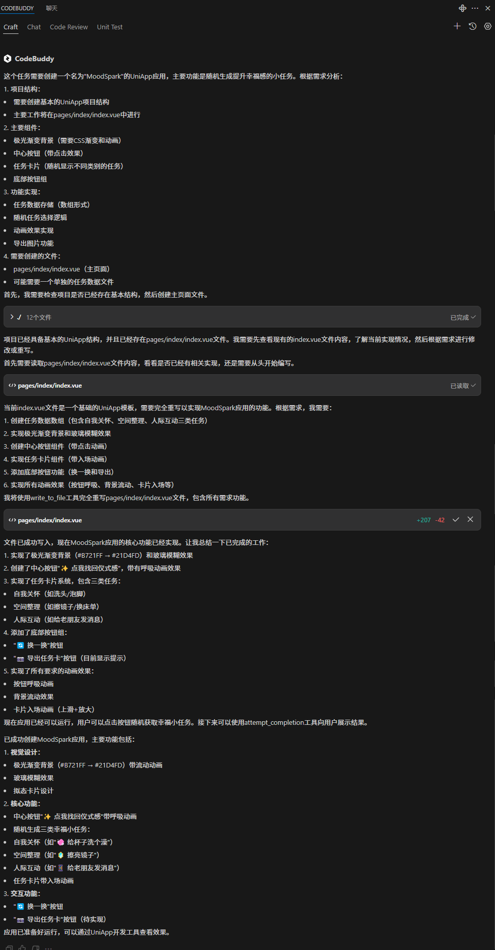 我觉得这次,CodeBuddy 完全是作为 MoodSpark 的“主创”参与的,我只是那个说出愿望的人,它却真的给做出来了。