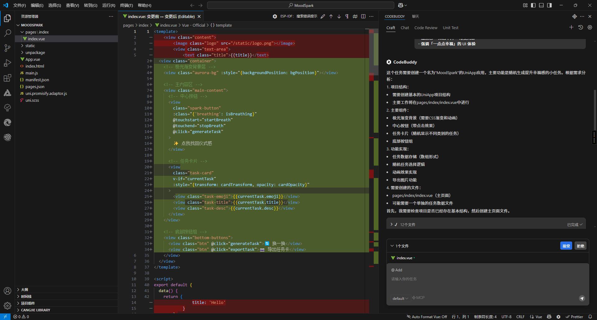 它先检查了项目主页面 pages/index/index.vue,发现只是个基础模板,干脆重新整了整个页面的逻辑和结构,直接奔着 MoodSpark 的体验去。
