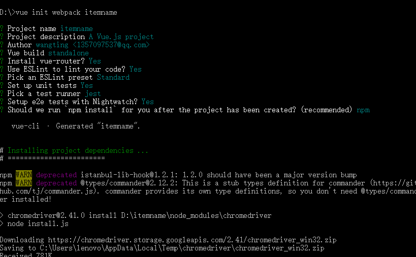 的命令,回车键进入d盘;回车键默认创建项目信息。