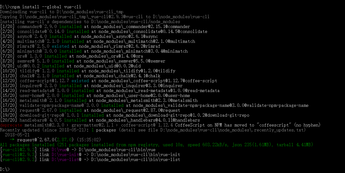 淘宝镜像安装成功之后,我们就可以全局vue-cli脚手架,输入命令:cnpm install --global vue-cli 回车;验证是否安装成功,在命令输入vue,出来vue的信息,及说明安装成功;