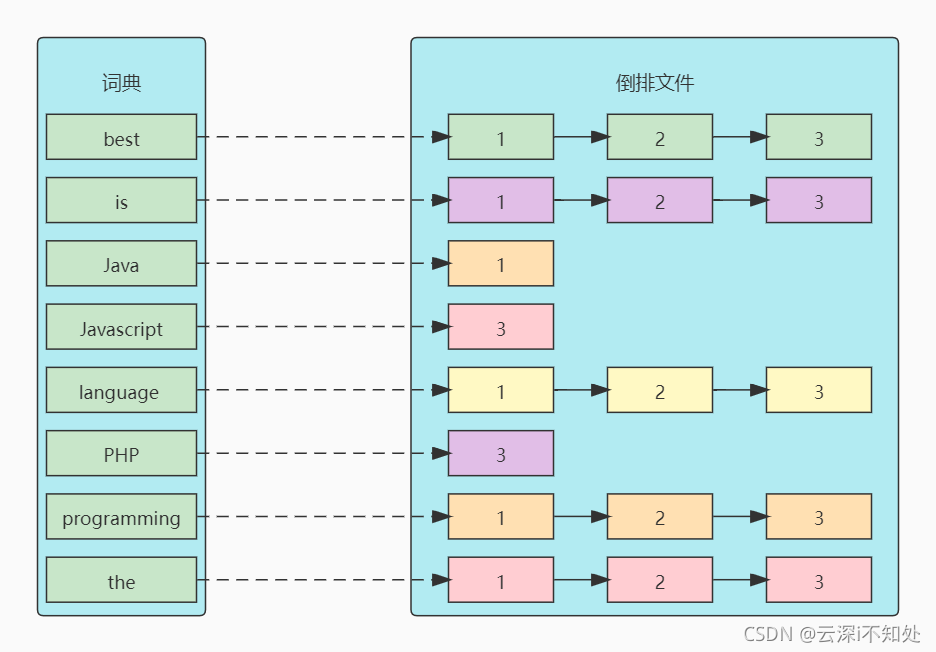 这种结构由文档中所有不重复的词的列表构成,对于其中每个词都有至少一个文档与与之关联。这种由属性值来确定记录的位置的结构就是倒排索引,带有倒排索引的文件被称为倒排文件。