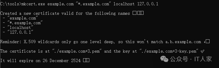 C:\tools>mkcert.exe example.com "*.example.com" localhost 127.0.0.1