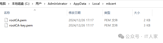 进入C:\Users\Administrator\AppData\Local\mkcert路径查看根证书和私钥文件