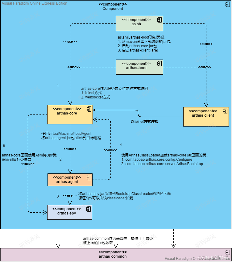 arthas-core根据用户选择的PID,利用Java Agent机制使用 arthas-agent 对目标进程进行增强;arthas-agent被唤醒后,就会启动命令行服务器监听命令,并匹配对应的命令处理器(XxxCommand)对用户命令进行处理,并返回。