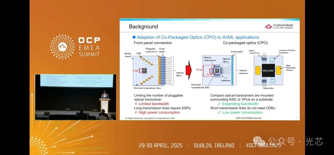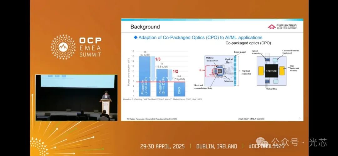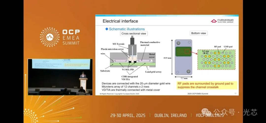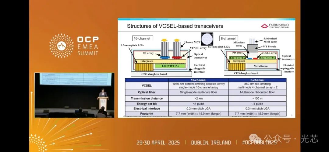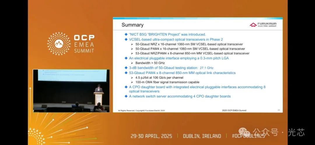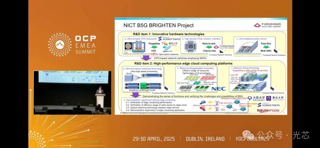 一、引言 在日本信息通信技术研究所(NICT)主导的B5G Brighten国家项目框架下,日本古河电气(Furukawa Electric)的Hideyuki Nasu团队针对AI机器学习互连场景,开发了基于基于VCSEL的超紧凑光学收发器及高密度可插拔电接口。该项目始于2021年,于2025年3月结题,核心目标是通过共封装光学(CPO)技术降低数据中心链路功耗。