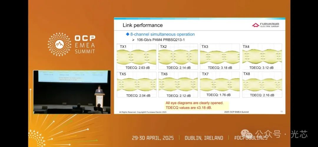 实测光电链路支持32Gb/s NRZ(PCIe 5.0)、64Gb/s PAM4(PCIe 6.0)和106Gb/s PAM4(以太网)信号,误码率(BER)低于KP4-FEC阈值,最低链路能量4.5pJ/bit。8通道106Gb/s PAM4同时工作时,眼图全部张开,最差通道的TDECQ<3.18dB,误码率达标。