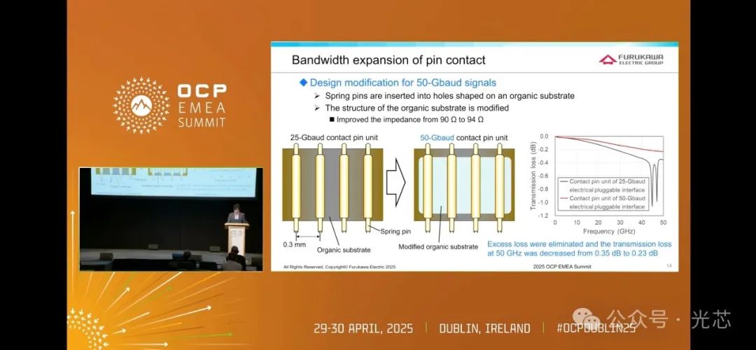 - 传统基板在28Gbaud时带宽受限(24GHz),通过coreless中介层基板将带宽提升至26.5 GHz以上(>50GHz),有效降低阻抗失配,Via间距可以缩小到0.3mm。