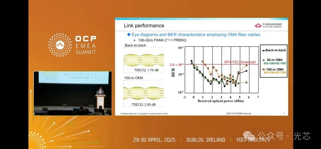 此外还测试了OM4多模光纤的传输性能:背靠背传输时TDECQ为1.76 dB,通过100米OM4光纤后TDECQ为2.9 dB,50米和100米OM4光纤传输后的误码率均低于KP4 FEC阈值。