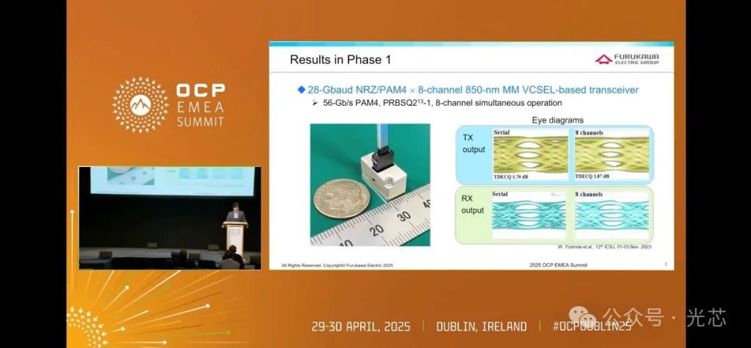 成功演示25Gbaud NRZ调制的16通道单模VCSEL收发器,在2公里多芯光纤上实现全通道同时传输,实测链路能量5pJ/bit。