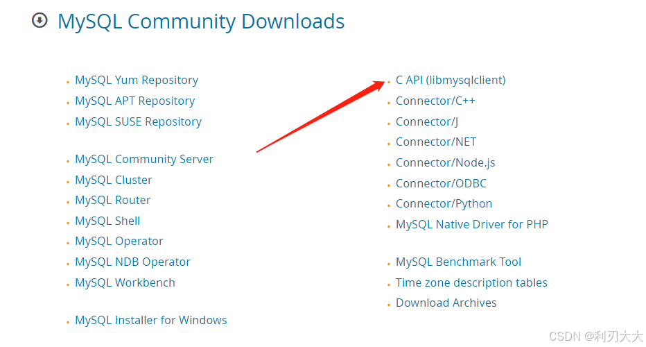 这里我们要使用 C 语言连接 mysql 的话,需要使用 mysql 官网提供的库,大家可以去官网下载。