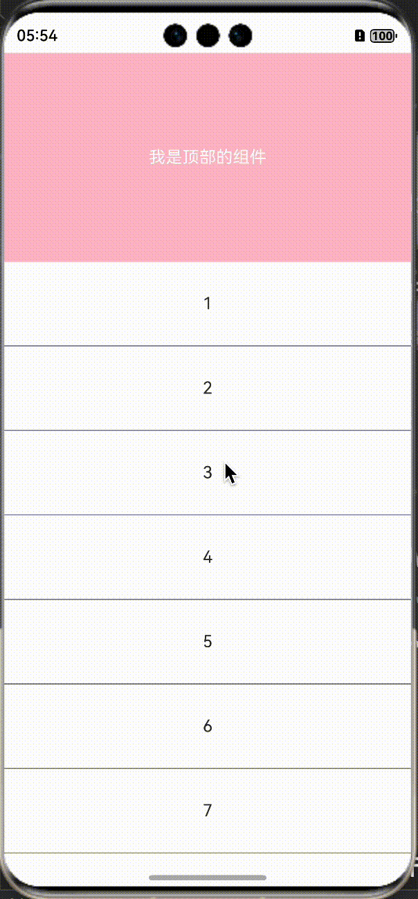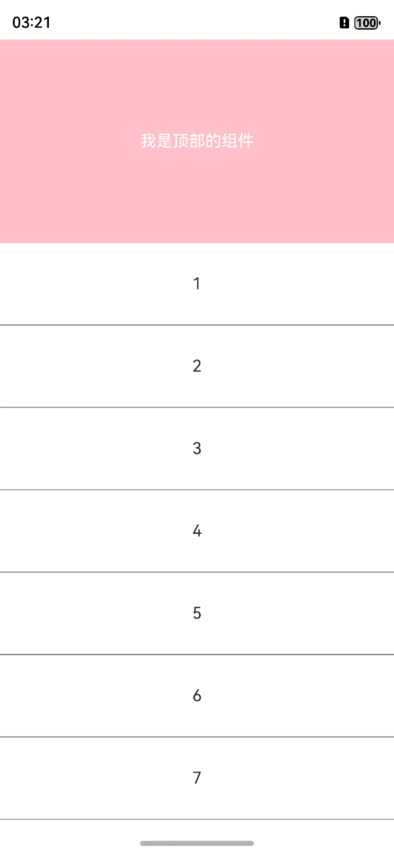 我们想要的效果是,先让顶部的组件滚动上去,然后再滚动下面的List组件,我们运行看下效果: