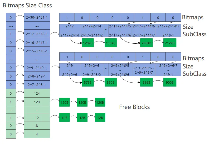 根据空闲内存块的大小,使用多个空闲链表来管理。根据内存空闲块大小分为两个部分:4, 127和2^7, 2^31,如上图size class所示: