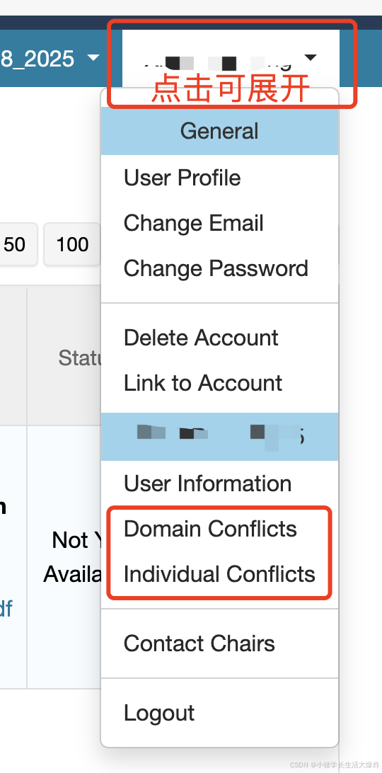 1、进入你要投的会议界面,再点击右上角姓名处,就会出现两个Conflicts