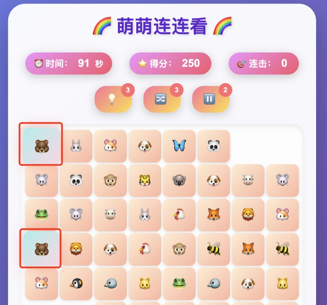 所有模型生成的游戏都是能正常操作的,可以消除图案相同的方块,也可以使用提示、洗牌、停止计时、炸弹等道具。但是 AI 对连连看游戏的理解好像有点问题,比如下面这种情况,我记得是能消除的吧?但是生成的游戏无法顺利消除。。。