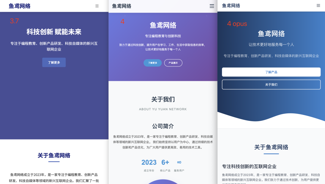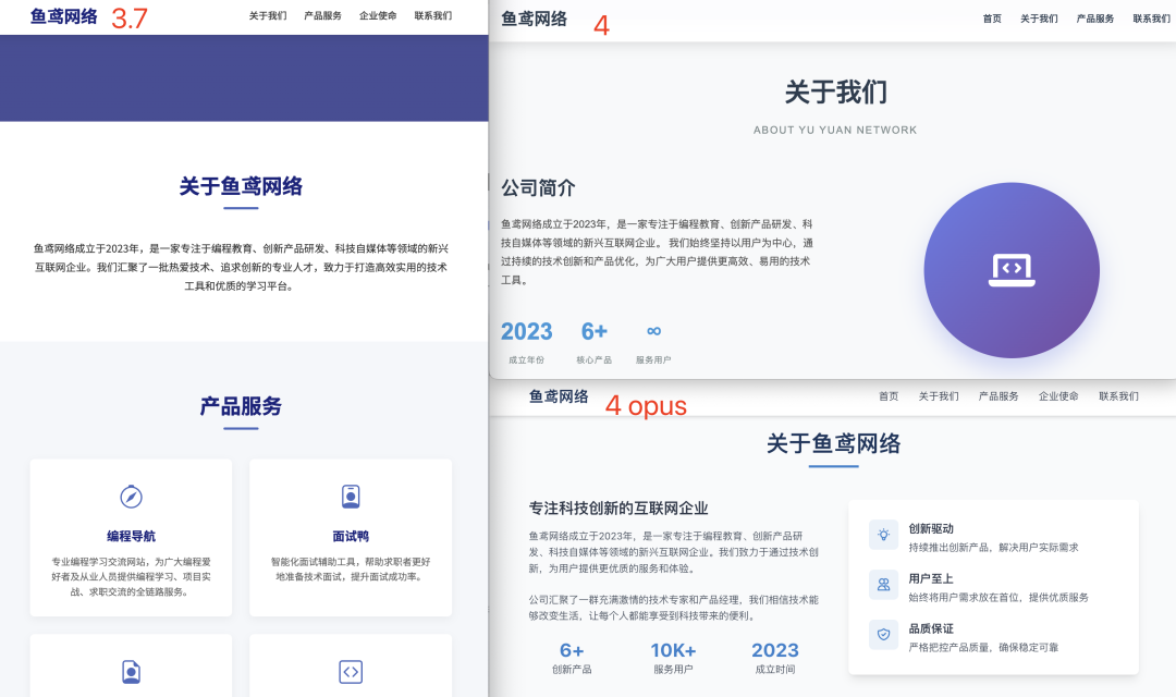 但是 PC 端大屏的区别就很明显了,从 “关于我们” 板块就能看出,claude-4-sonnet 和 claude-4-opus 生成的页面明显具有更多的细节,让网站内容更充实。这波又是新模型的胜利~