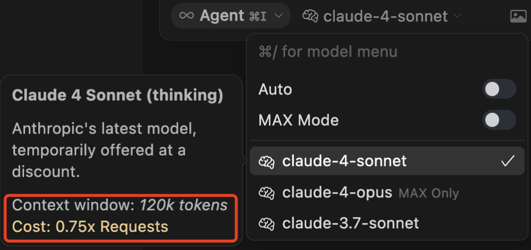 对了,还得提醒一下,目前使用 claude 4 系列模型是按照 token 计费的,Claude 官方给出的价格是 Opus 4 每百万 token 15/75美元(输入/输出),Sonnet 4 为 3/15 美元。而在 Cursor 中使用 Opus 4 是按 token 计费,使用 Sonnet 4(非 MAX 版本)是按照请求数计费,目前还有 75 折,一个请求大概是 0.04 美元。