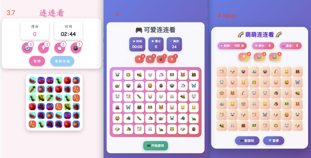 每个模型都理解了任务,生成出了经典连连看游戏的页面,都显示了得分、时间和道具。但是界面美观度高下立判啊!claude-3.7-sonnet 生成的游戏带着一股土味儿,而 claude-4-sonnet 和 claude-4-opus 界面都很软萌 Q 弹,风格也比较接近,不愧是同系列的模型。