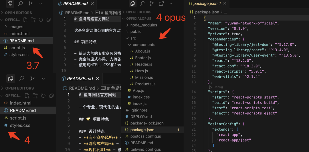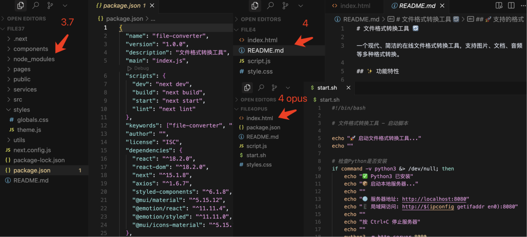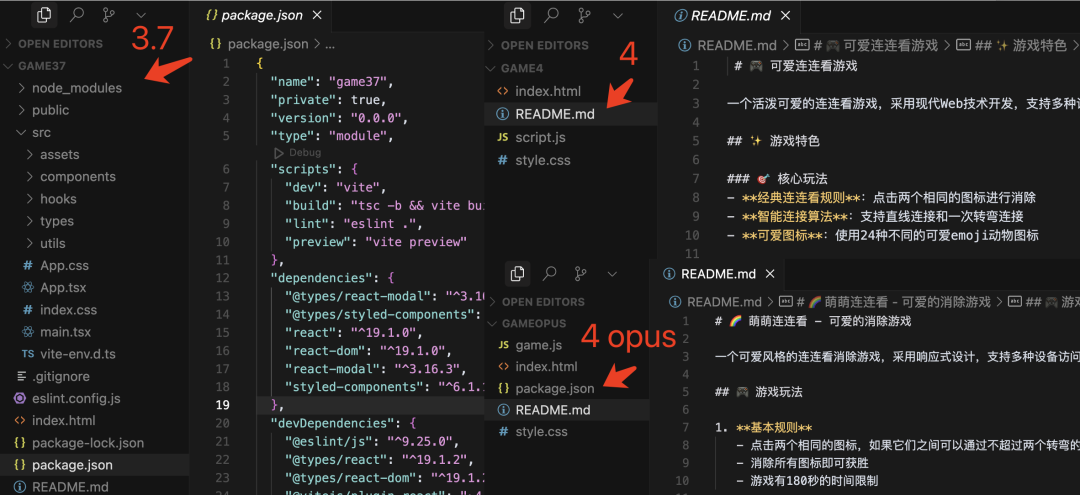 这次的生成结果可就有意思了,claude-3.7-sonnet 和 claude-4-sonnet 直接使用最基础的前端三件套(HTML + CSS + JavaScript)完成了项目,而 claude-4-opus 却使用了 React 前端框架技术来生成代码,并且把一个简单的页面拆分成了很多个小组件。