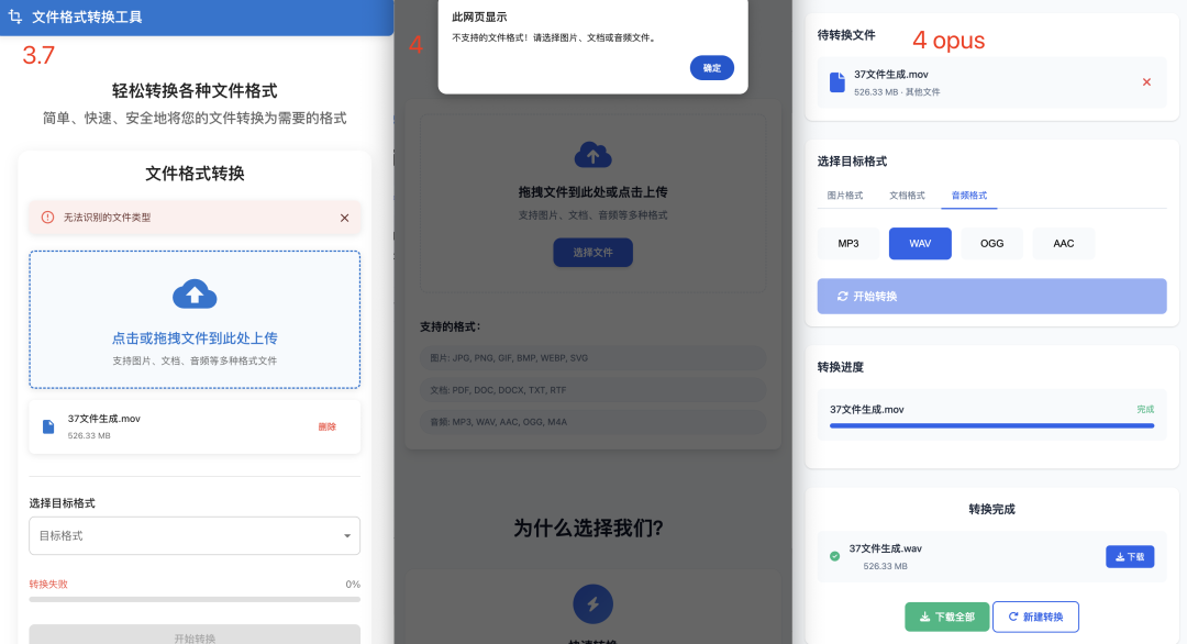 有意思的是,如果我上传一个不支持的格式,claude-3.7-sonnet 会给出弱弱的警告;claude-4-sonnet 会给出更强力的弹窗警告;而 claude-4-opus 可以说是死鸭子嘴硬,我可以继续选择转换格式,它也装作能处理的样子,还给我提示转换成功。