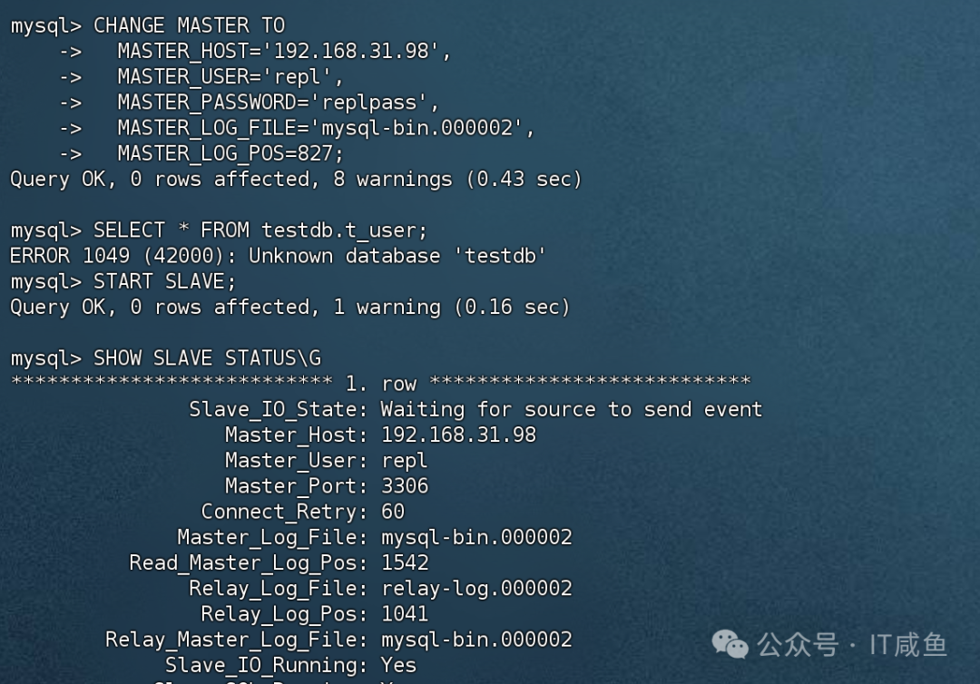 检查 binlog 文件名、位置是否正确;网络是否能 ping 通主机如果你能理解本文内容并亲手搭建成功,恭喜你,离成为“靠谱的DBA”更近了一步!