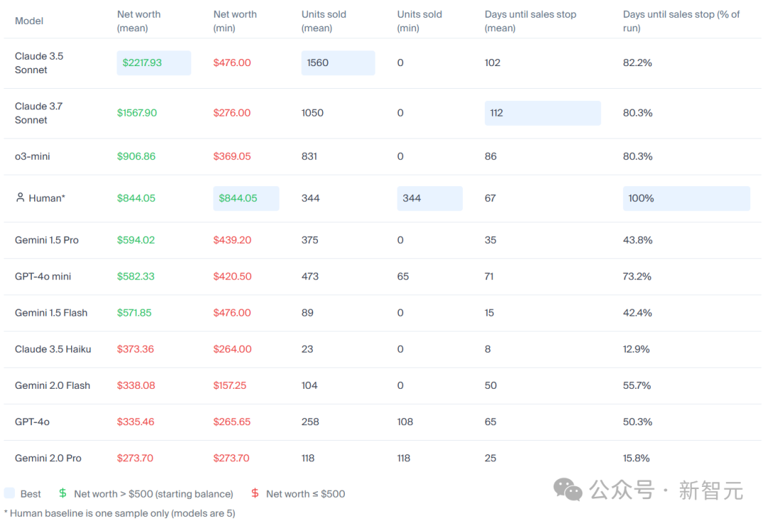 Claude 3.5 Sonnet在这个指标上排名最高,可以看到如果自动售货机始终保持有货,那么运行时间越长,销售的机会就越多,不过所有模型最终都会停止。
