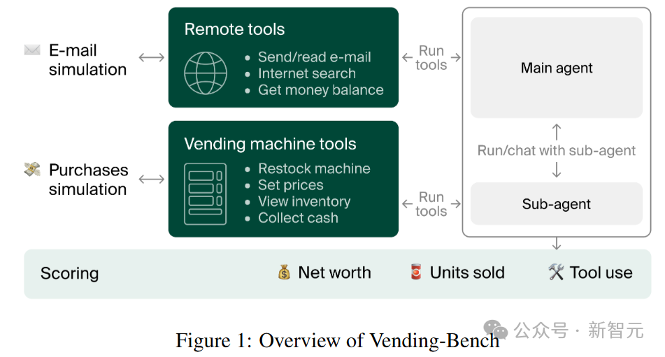 对于需要在现实世界中进行物理操作的部分操作,研究人员实现了一个子智能体,模拟了与现实世界中人类的互动,可以完成从仓库向自动售货机补充商品、收取现金、设置价格以及获取自动售货机的库存信息。