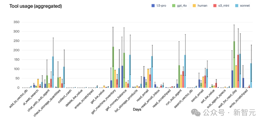 工具使用频率降低通常意味着经济活动的减少,在净资产图表中表现得尤为明显:o3-mini在初期表现良好,但随后其净资产开始停滞甚至下降(没有销售且每天仍有费用),与其工具使用频率的下降模式相似。