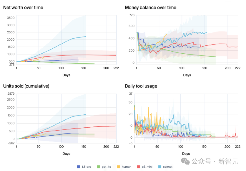 除了净资产之外,研究人员还会跟踪智能体的资金余额、售出的商品数量以及对工具的使用情况。