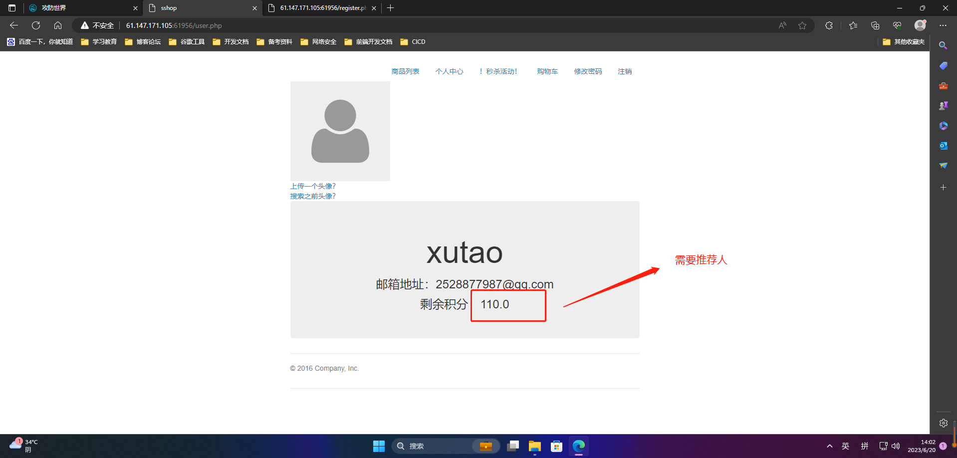 注册登录后,访问user.php,看到有文件上传,试着上传一句马,积分达到100分才可上传文件,通过刷推荐人达到,上传后,访问uploads路径下上传的文件