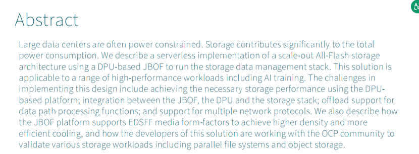 这次演讲介绍了一种使用基于DPU 的 JBOF(Just a Bunch of Flash)来运行存储数据管理栈的Scale-out全闪存存储架构的serverless实现方案。该解决方案适用于包括AI 训练在内的一系列高性能工作负载。