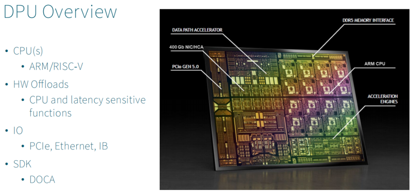 比如多个ARM或者RISC-V的CPU(BlueFiled是16 个 ARM Cortex-A78核心),很多硬件卸载(循环密集型和延迟敏感型)、IO(1个PCIe 5.0 Switch、2个400Gb Eth接口、IB) 、SDK(DOCA,会保证今天的DPU应用在后续的DPU上都能跑起来)