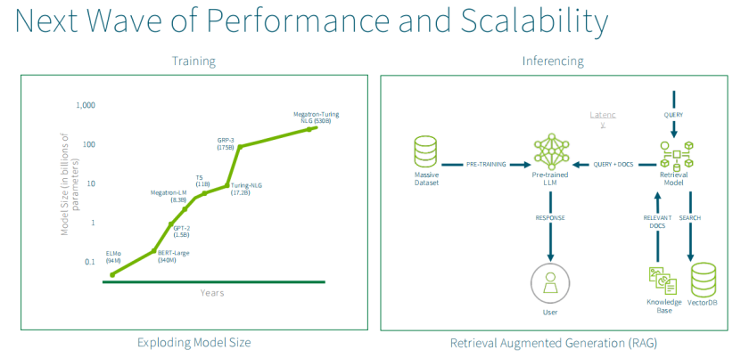 RAG使用向量数据库来做到这一点,并将所有查询进行检查,并将更新的查询信息放入向量数据库,因此它一直在增长。所以在推理侧也需要大量的性能。