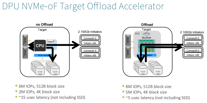 DPU功耗比x86少得多,但它针对不同市场的卸载有很多。下面这个PPT显示了针对JBOF或者其他存储设备的卸载。DPU将NVMe转换成,不需要ARM处理器参与的、完全硬件化的NVMe over Fabric。只需要ARM处理器参与处理问题或者加载映射表。