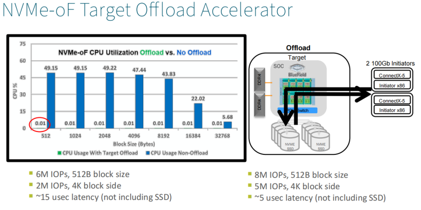 下图是BlueField DPU在存储中的解决方案。它不仅被应用于JBOF中,而且在存储数据的整个路径上(前端或者客户端)都有应用。PPT左边列出了三项: