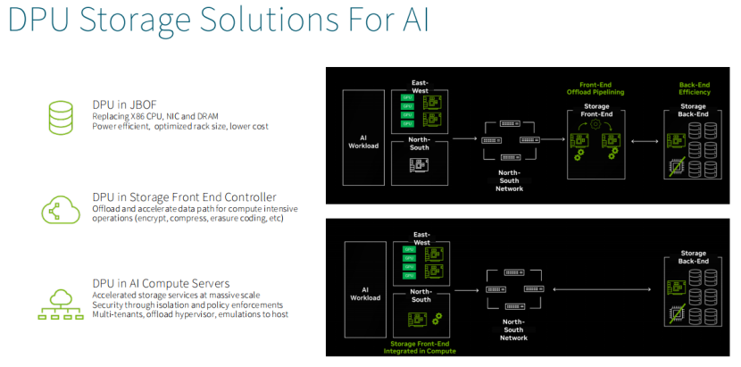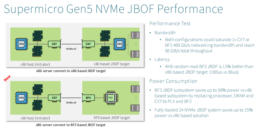 左边上半部分是传统x86方案,下半部分是使用了BlueFiled3 DPU的JBOF方案。