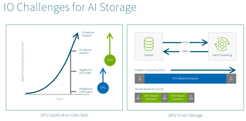 演讲人打了个比方,GPU和青少年一样,永远很饿。青少年对冰箱里的食物感到饥饿,而GPU则是对数据很饥饿。PPT左边的图说明,CPU数据集的数量级是GB级别,而GPU的数据集的数量级则是TB或者PB级别。