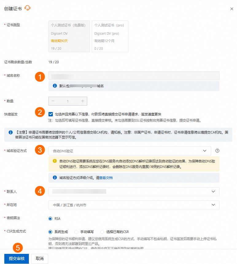 3、在个人测试证书(原免费证书)页签单击创建证书,填写以下必要信息,其他保持默认即可,确认信息无误后,单击提交审核。