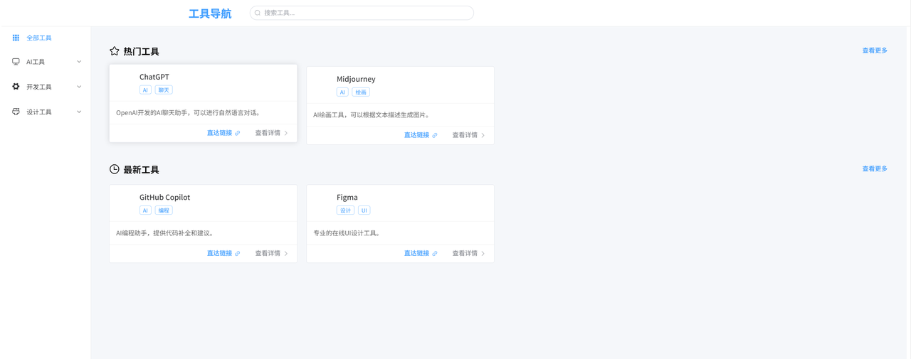 2. 工具卡片展示: 美观的卡片式布局,显示工具详情、标签等信息