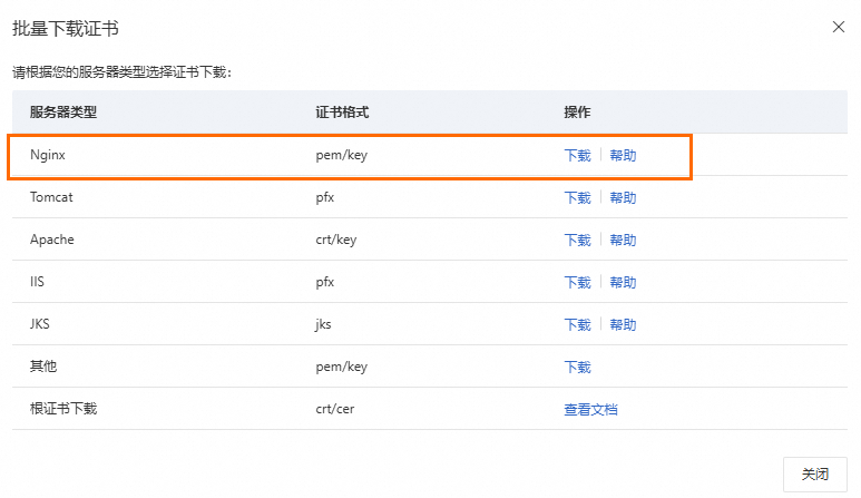 4、域名所有权验证成功后,证书通常会在1~15分钟(平均时长)内完成签发。证书签发后,证书状态将变更为已签发。选择与您Web服务器类型对应的证书(如Nginx),单击下载证书文件压缩包。