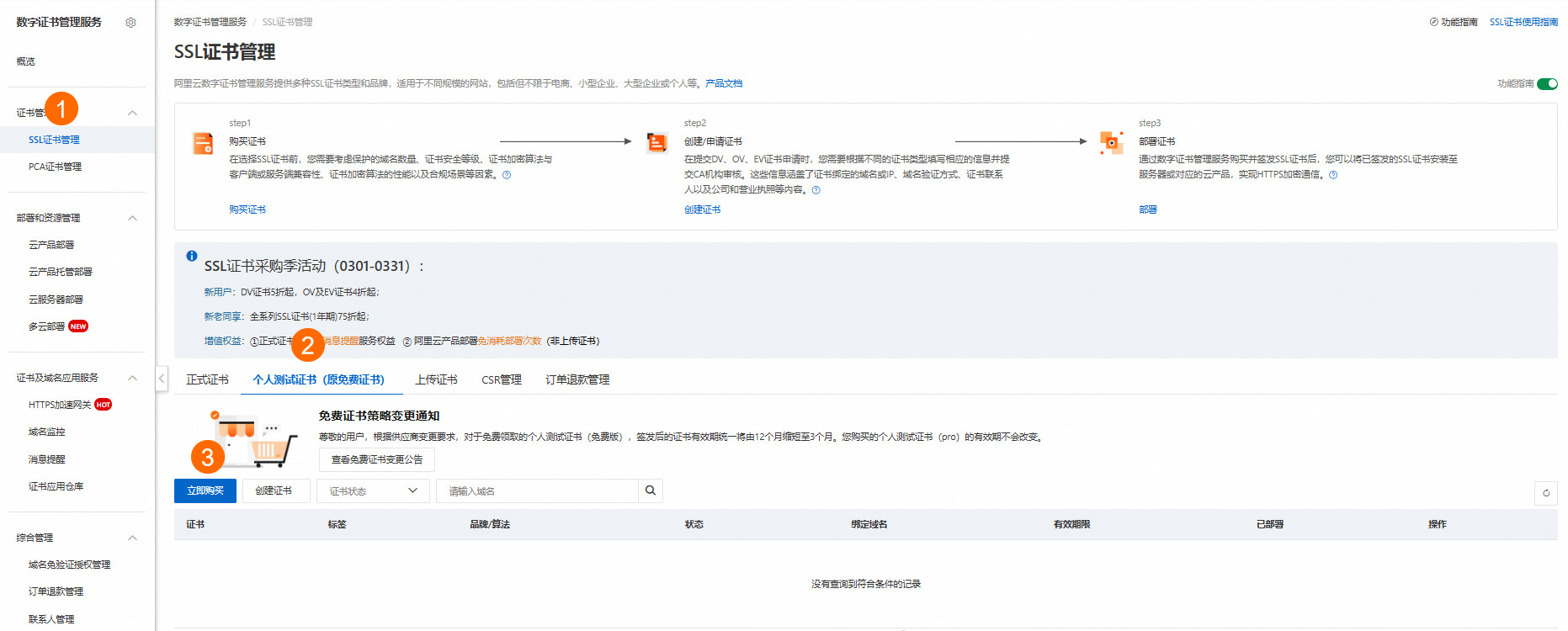 。在个人测试证书(原免费证书)页签,单击立即购买。