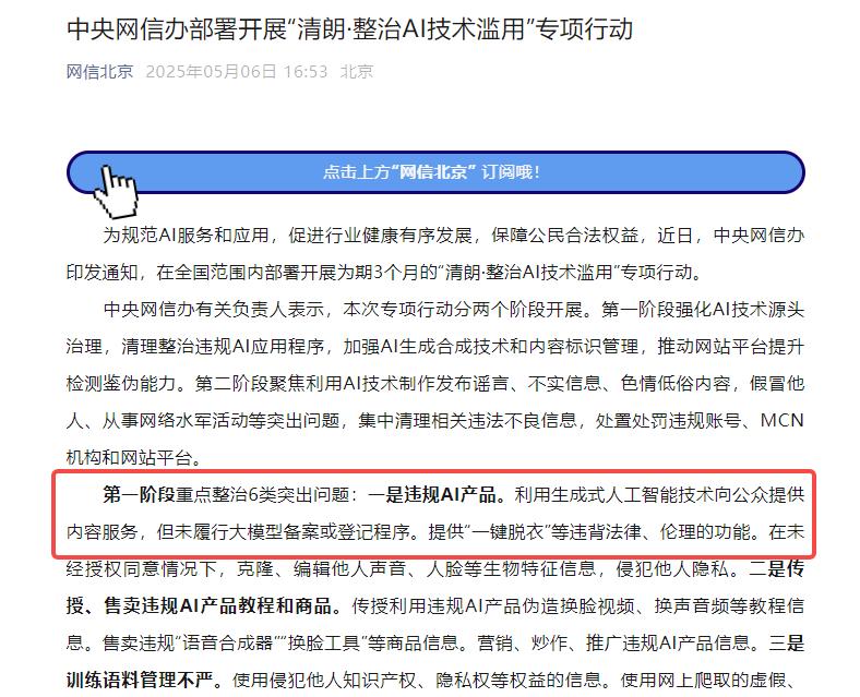 近期中央网信办在全国范围内部署开展“清朗·整治AI技术滥用”专项行动,其中提到的第一个整治问题就是:利用生成式人工智能技术向公众提供内容服务,但未履行大模型备案或登记程序的违规AI产品,各AI应用企业应做好自查,自觉履行大模型备案。