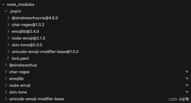 30559101 lrwxr-xr-x 1 ligang staff 46 8 6 16:59 node_modules/node-emoji -> .pnpm/node-emoji@2.1.3/node_modules/node-emoji.pnpm 的存在避免了循环引用和层级过深的问题(扁平化)